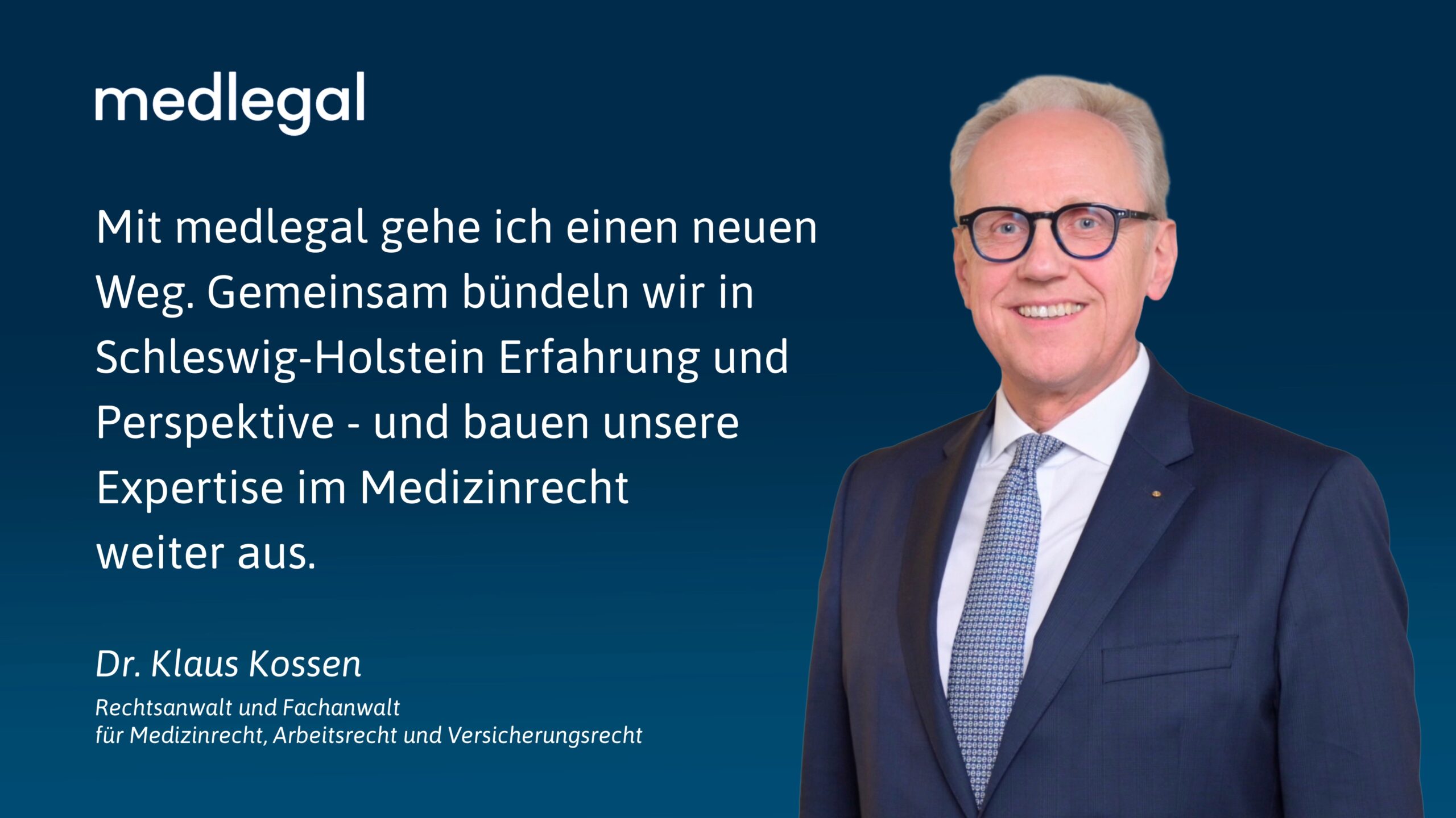 Wir freuen uns sehr, mit Dr. Klaus Kossen eine prägende Persönlichkeit des Medizinrechts in Schleswig-Holstein für medlegal gewonnen zu haben. Gemeinsam stärken wir unsere Position in diesem Bereich und führen gewachsene Expertise mit neuen Perspektiven zusammen.